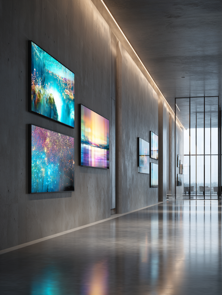 Wall mounted digital screens are the most versatile and cost-effective way to advertise in any commercial environment. Unlike static signage, they let you update messaging instantly, schedule campaigns automatically, and react to real-time events without print costs or installation delays. Outdoor-rated models are weatherproofed and anti-glare treated, while indoor screens offer stunning 4K clarity at close viewing distances — and any number of screens can be networked together to create a synchronised multi-panel display across your entire space.